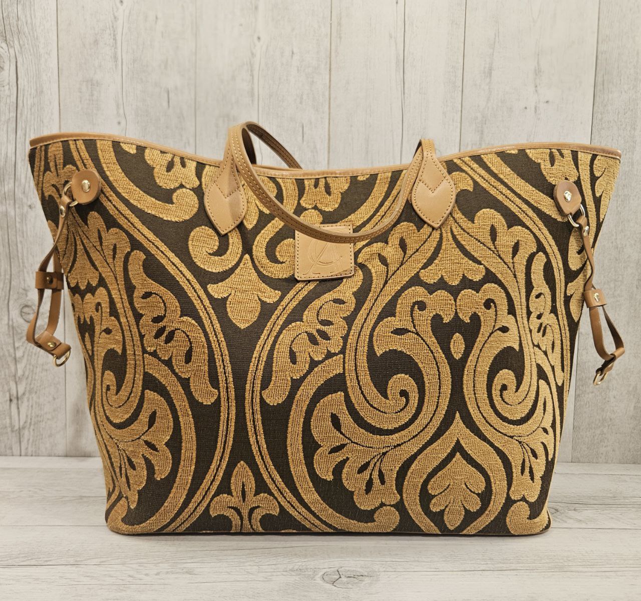 Borsa a spalla capiente e leggera in tessuto con rifiniture in vera pelle.